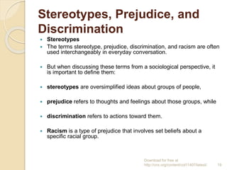 They may be positive but are often negative usually toward other groups such as when members of a dominant group suggest that a subordinate group is stupid or lazy. African Americans for example were seen as lazy ignorant and happy-go-lucky while White Americans were seen as industrious progressive and intelligent. Stereotype Gender group Pluralism Sociology Minority group Assimilation Conflict perspective Segregation Ethnic group Racism Class Subordinate group Social construction of race Racial group Religious minority group.